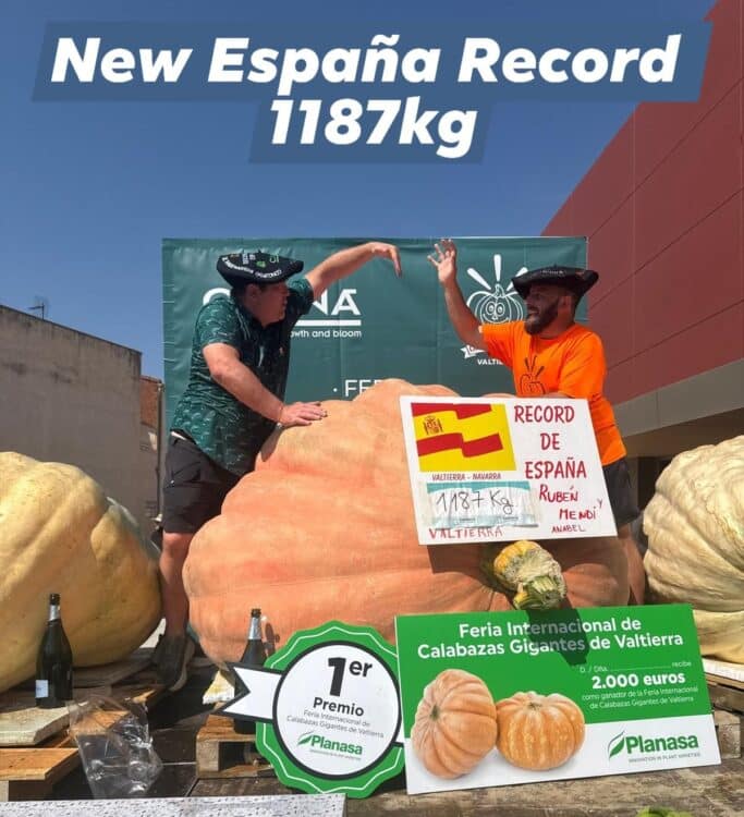 Rubén Mendi, a local from Valtierra, holds the Spanish record for giant pumpkins with a massive specimen weighing 2616 pounds / 1,187 kilograms, unveiled during Pumpkin Day in Valtierra Spain.